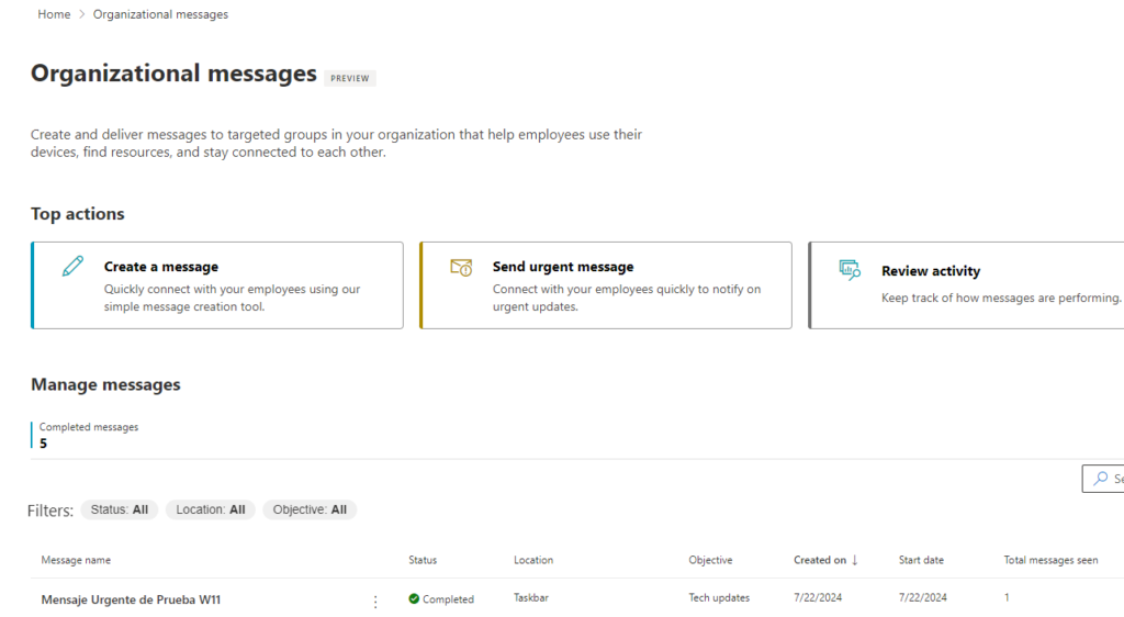 Consola de gestión centralizada: Permite a los administradores crear, administrar y revisar los mensajer desde una única vista ubicada en el admin center de Microsoft 365.