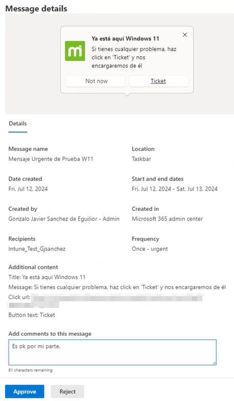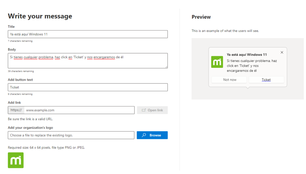 Los usuarios finales deben disponer de Windows 11 Enterprise actualizado para hacer uso de todas las opciones disponibles en los mensajes de la organización.